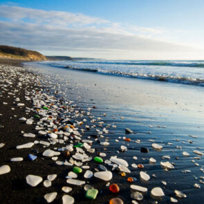 Когда-то Стеклянный пляж был обычной свалкой, куда местные жители выбрасывали мусор — от бытовых отходов до стекла и керамики. В течение десятилетий океанские волны и ветер делали своё дело: они разбивали и полировали осколки, превращая их в гладкие, блестящие камешки. Со временем мусор превратился в настоящее произведение искусства, созданное самой природой.
